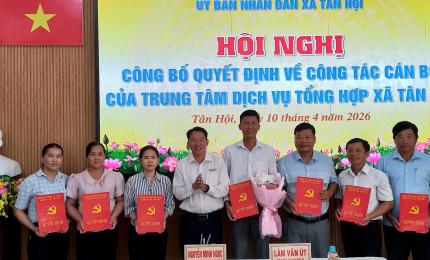 Sáng 10/4/2026, tại trụ sở UBND xã Tân Hội, Ủy ban nhân dân xã long trọng tổ chức lễ công bố các quyết định về công tác cán bộ của Trung tâm Dịch vụ tổng hợp xã.