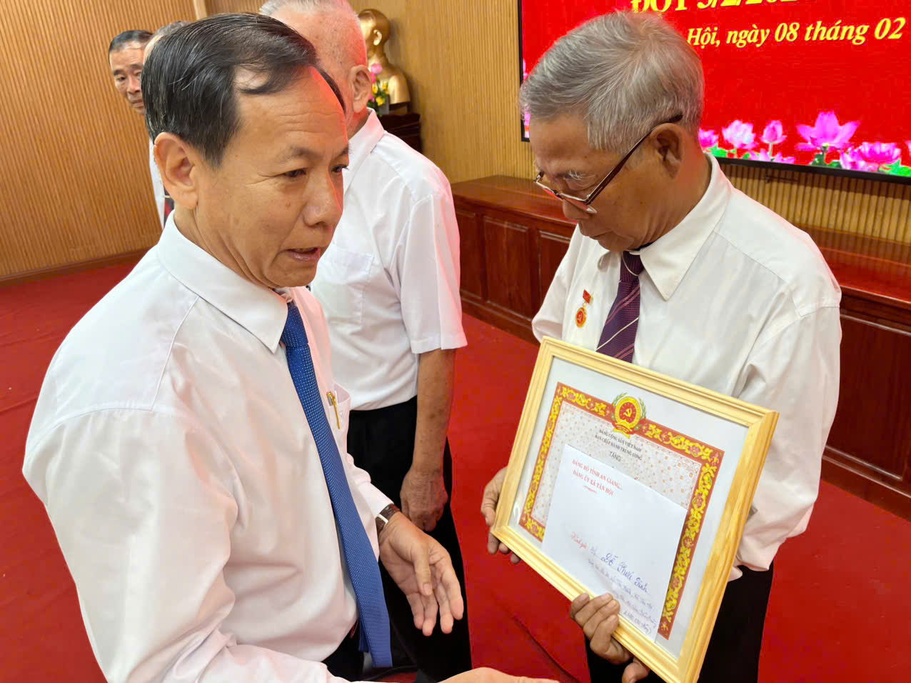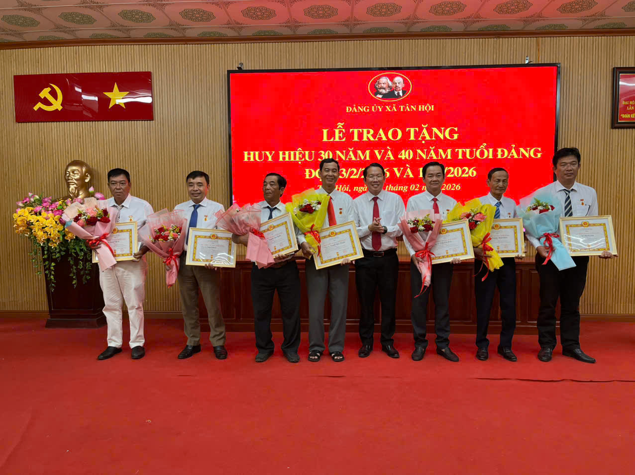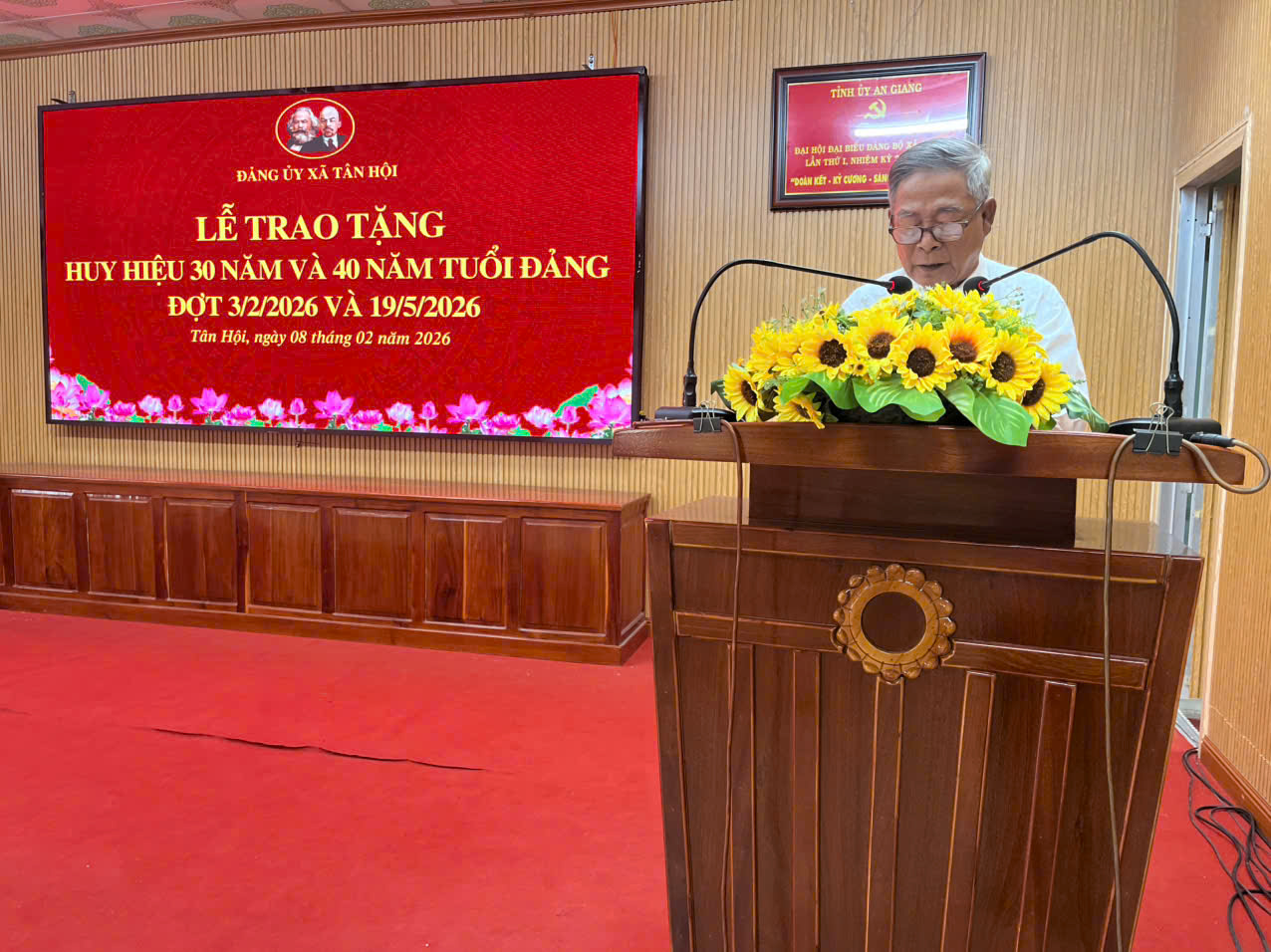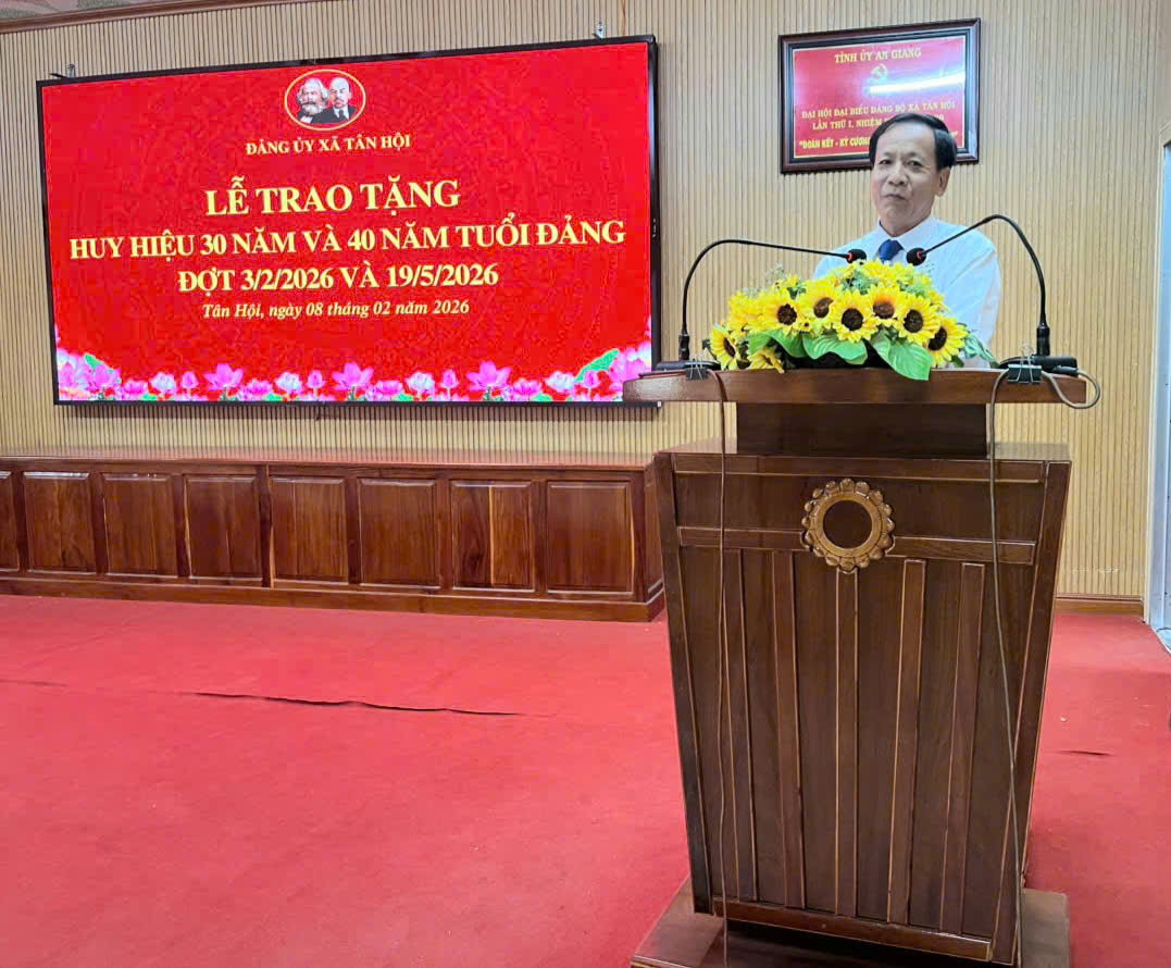 Sáng ngày 08/02/2026, Đảng ủy xã Tân Hội tổ chức Lễ trao tặng Huy hiệu Đảng 30 năm, 40 năm tuổi Đảng cho các đảng viên đủ điều kiện trên địa bàn xã, theo Quyết định số 161-QĐ/TU, ngày 13/01/2026 của Tỉnh ủy An Giang về việc trao tặng Huy hiệu Đảng đợt 3/2026.