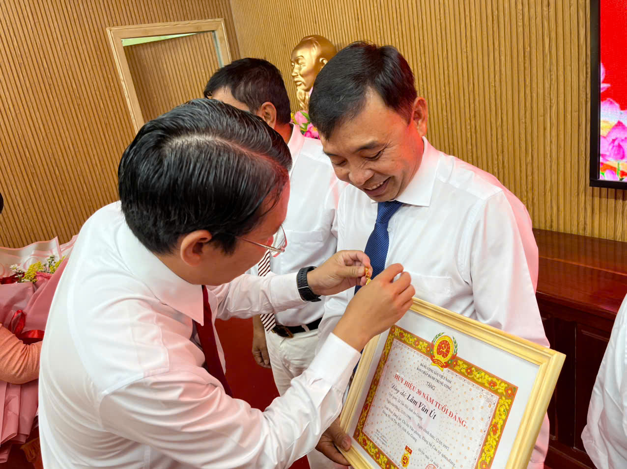Đến dự buổi lễ có đồng chí Nguyễn Hoàng Kha – Bí thư Đảng ủy xã; đồng chí Lâm Văn Út – Phó Bí thư Thường trực Đảng ủy, Chủ tịch HĐND xã; đồng chí Nguyễn Minh Ngọc – Phó Bí thư Đảng ủy, Chủ tịch UBND xã; cùng các đồng chí trong Ban Thường vụ Đảng ủy xã và các đảng viên được trao Huy hiệu Đảng đợt này.