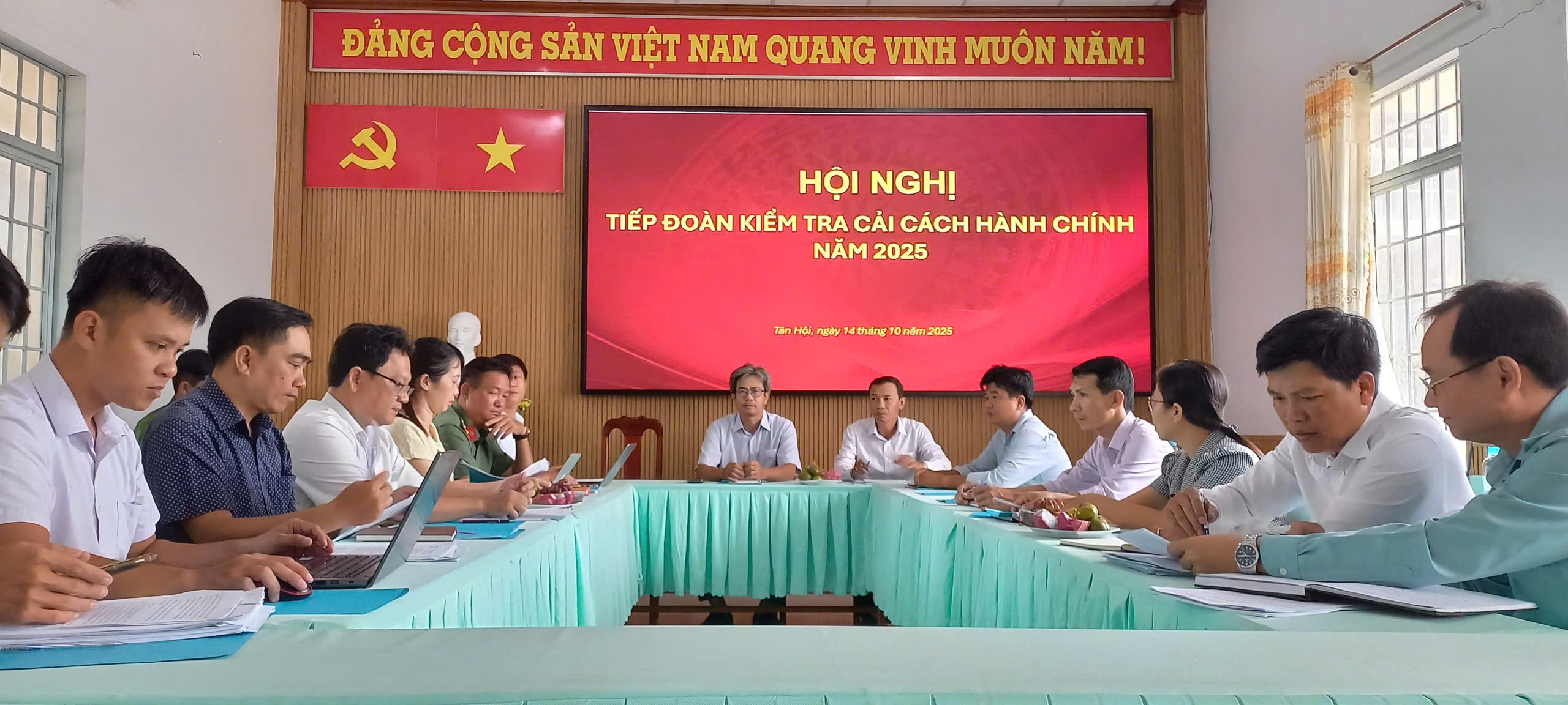Tiếp và làm việc với đoàn ông Lê Quang Nhựt, Phó Chủ tịch UBND xã Tân Hội, cùng lãnh đạo và chuyên viên Phòng Văn phòng HĐND- UBND; Phòng Kinh tế, Văn hóa- Xã Hội, Công an xã và Trung tâm Phục vụ hành chính công.