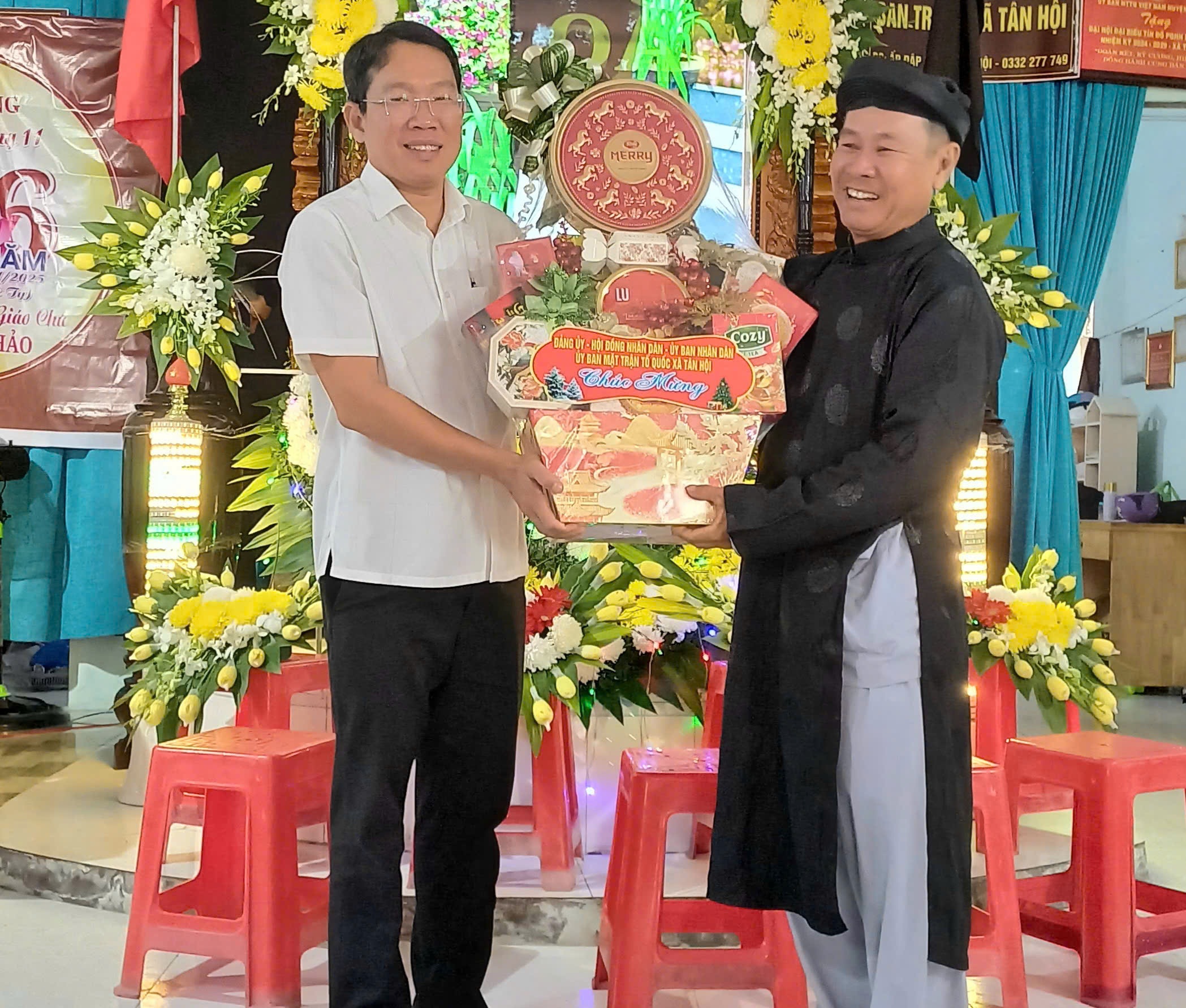 Ông Nguyễn Minh Ngọc, Phó Bí thư Đảng ủy, Chủ tịch UBND xã Tân Hội tặng quà cho Ban trị sự Phật giáo Hòa Hảo