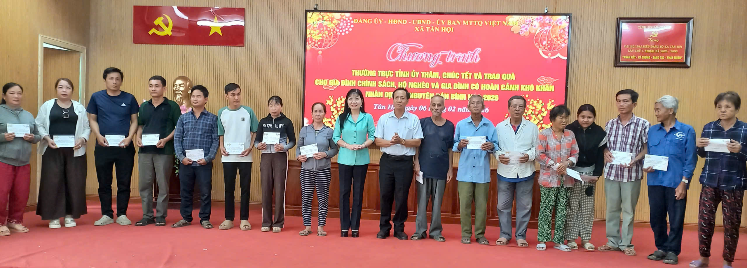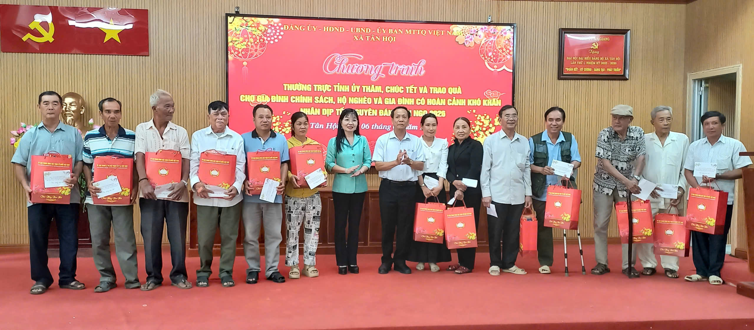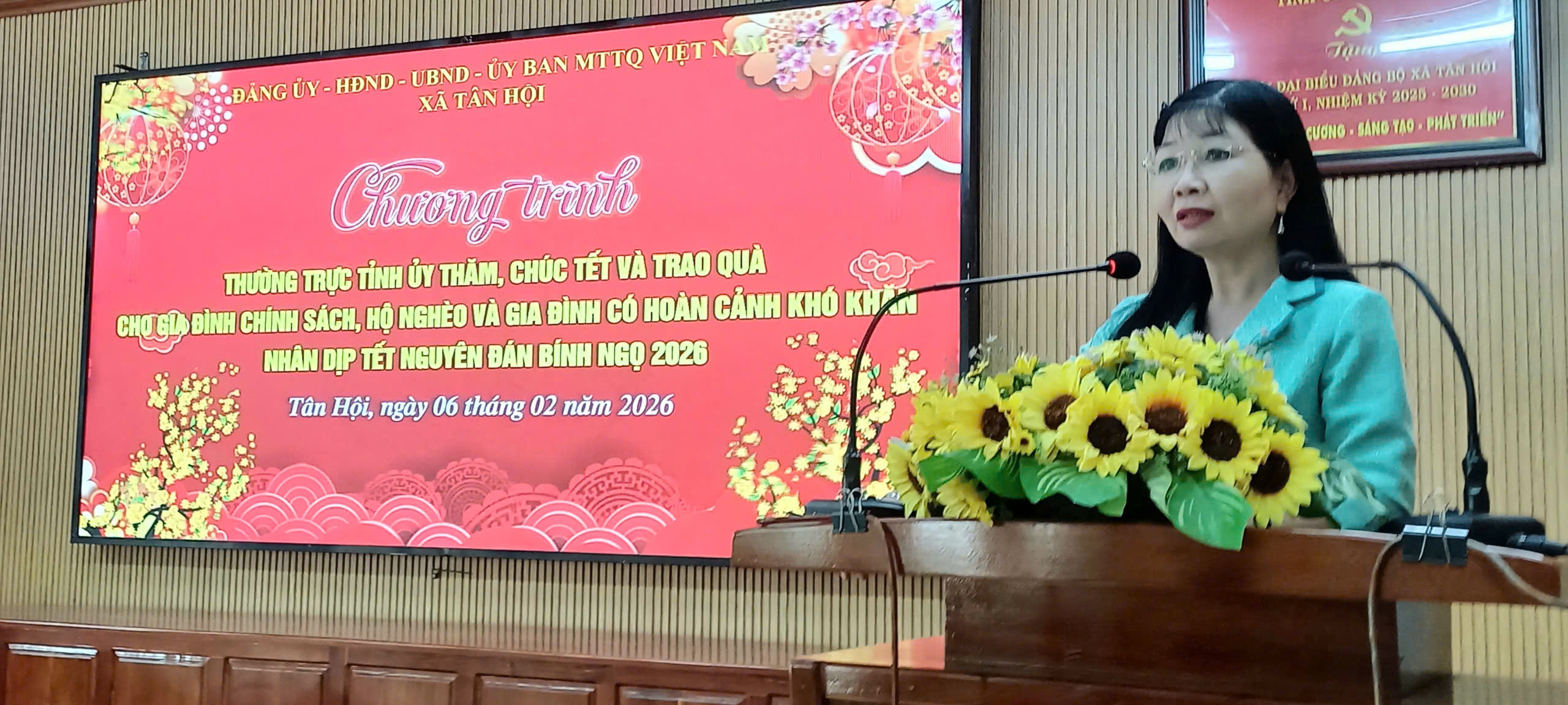 Nhân dịp Xuân Bính Ngọ 2026, đồng chí Trần Thị Thanh Hương, thay mặt Thường trực Tỉnh ủy, HĐND, UBND, Ủy ban MTTQ Việt Nam tỉnh, gửi lời chúc mừng năm mới đến Đảng bộ, chính quyền và Nhân dân xã Tân Hội dồi dào sức khỏe, hạnh phúc, an khang, thịnh vượng, gặt hái nhiều thành công; đồng thời chúc Đảng bộ, chính quyền địa phương đạt nhiều thắng lợi mới trong năm 2026.