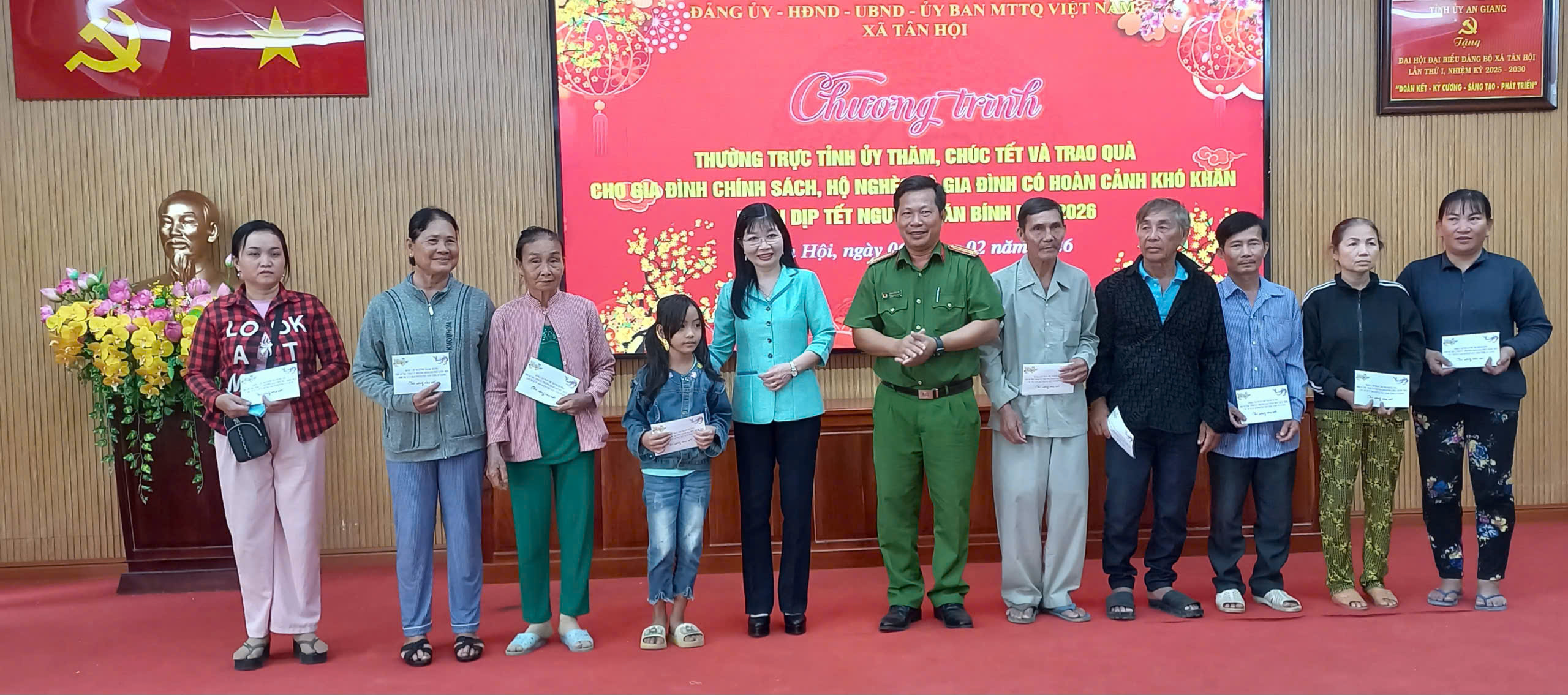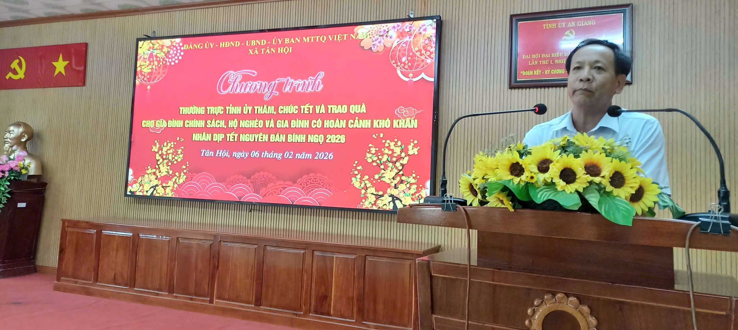 Chiều ngày 06/02/2026 (nhằm ngày 19 tháng Chạp năm Ất Tỵ), đồng chí Trần Thị Thanh Hương – Phó Bí thư Tỉnh ủy, Trưởng Đoàn Đại biểu Quốc hội đơn vị tỉnh An Giang, Chủ tịch Ủy ban MTTQ Việt Nam tỉnh đã đến thăm và chúc Tết Nguyên đán Bính Ngọ năm 2026 xã Tân Hội.