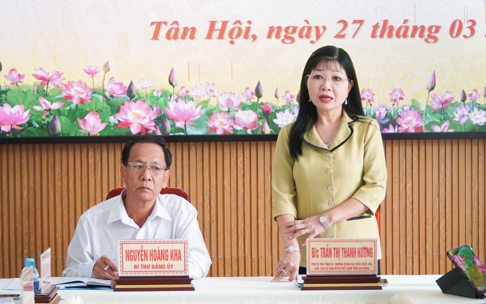 Tại buổi làm việc, Phó Bí thư Tỉnh ủy, Chủ tịch Ủy ban MTTQ Việt Nam tỉnh An Giang Trần Thị Thanh Hương nhấn mạnh, giải ngân vốn đầu tư công là nhiệm vụ chính trị trọng tâm, gắn với trách nhiệm của cả hệ thống chính trị, nhất là ở cơ sở. Địa phương cần rà soát, xác định rõ các khó khăn, vướng mắc để kịp thời tháo gỡ; nội dung thuộc thẩm quyền phải chủ động xử lý, những vấn đề vượt thẩm quyền cần báo cáo, kiến nghị sở, ngành và chủ đầu tư xem xét giải quyết.