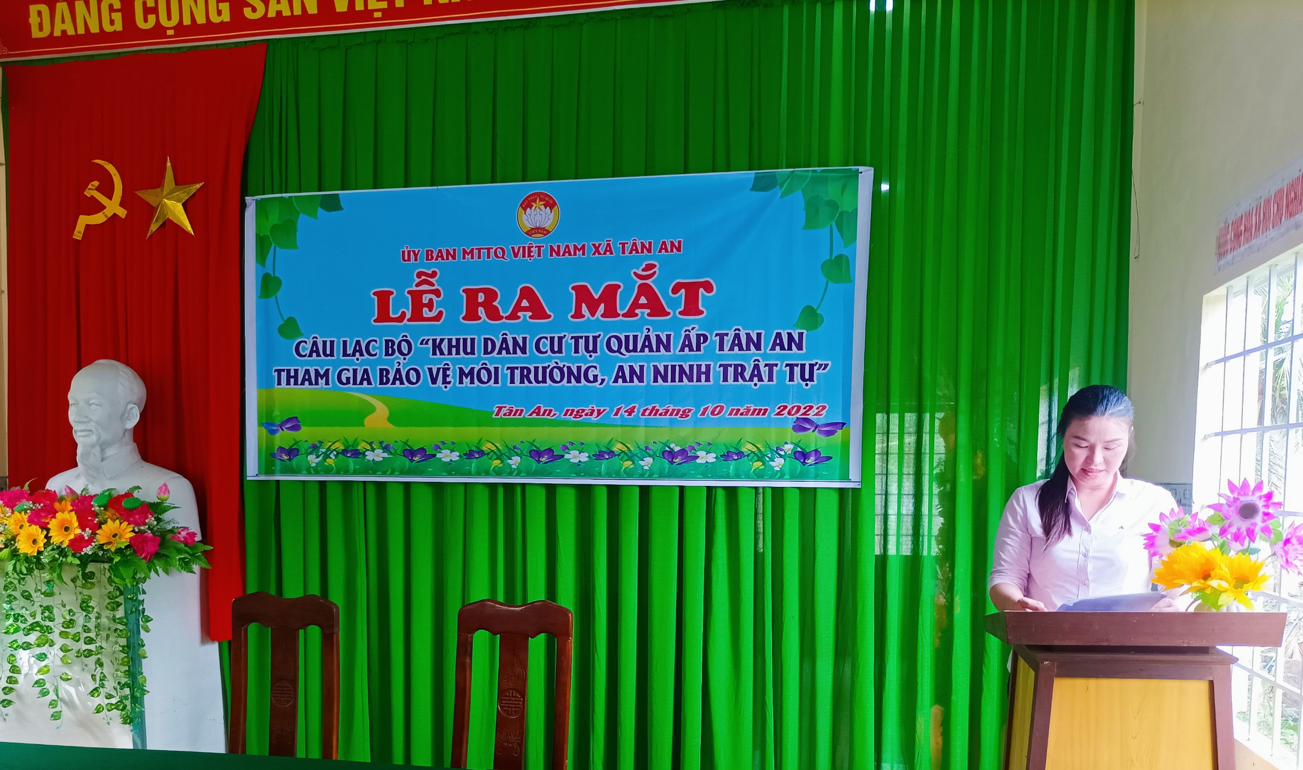 Sáng ngày 14/10/2022 tại Trụ sở ấp Tân An, Ủy ban Mặt trận Tổ quốc Việt Nam xã Tân An tổ chức ra mắt Câu lạc bộ “Khu dân cư tự quản tham gia bảo vệ môi trường, an ninh trật tự” năm 2022.