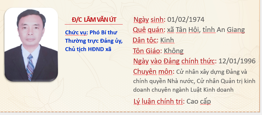 | Đồng chí Lâm Văn Út, Phó Bí thư Thường trực Đảng ủy- Chủ tịch HĐND xã Tân Hội | ![]() |