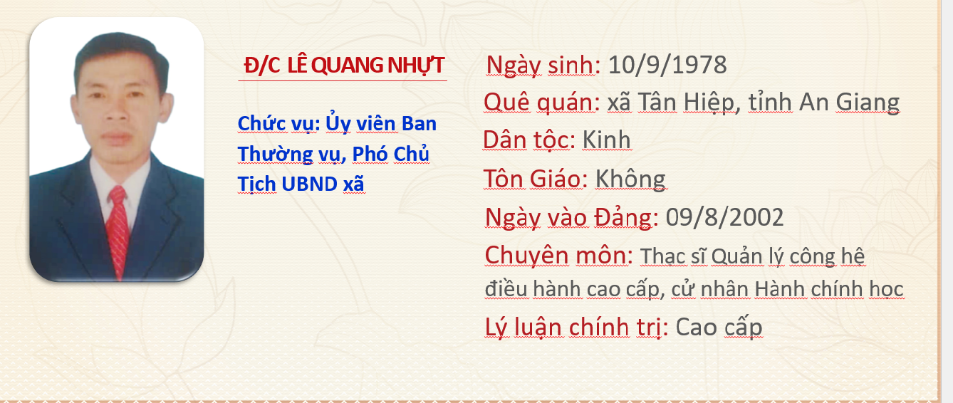 | Đồng Chí Lê Quang Nhựt; Phó Chủ tịch UBND Xã Tân Hội (Phụ trách Văn Hóa- Xã Hội). SĐT: 0919116620 | ![]() |