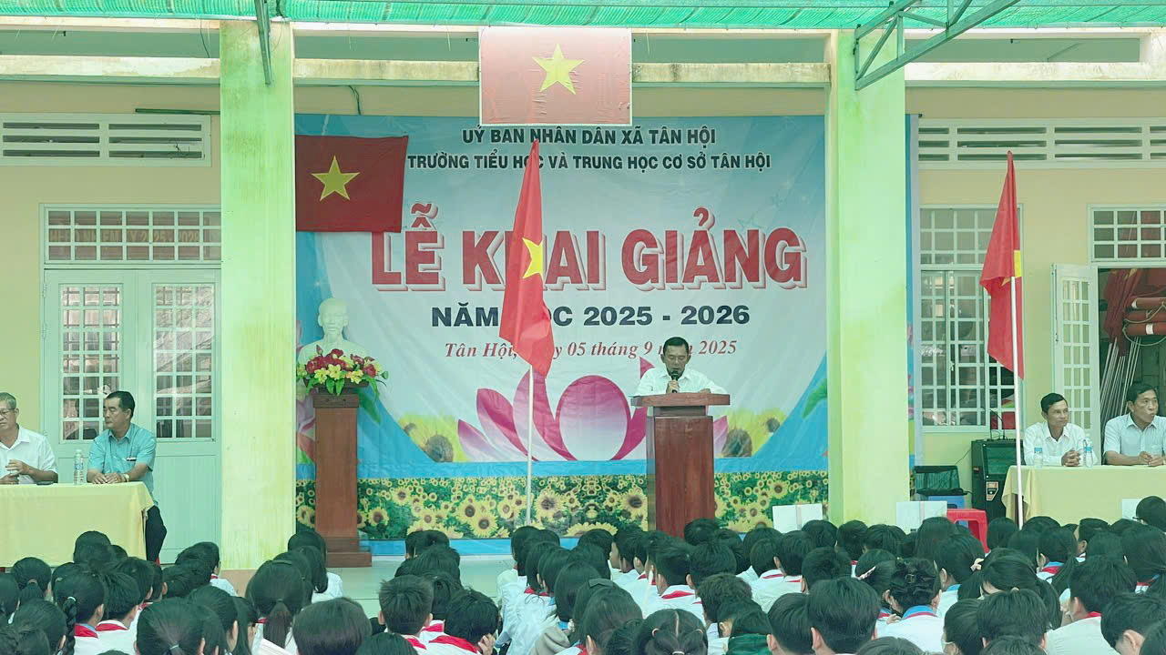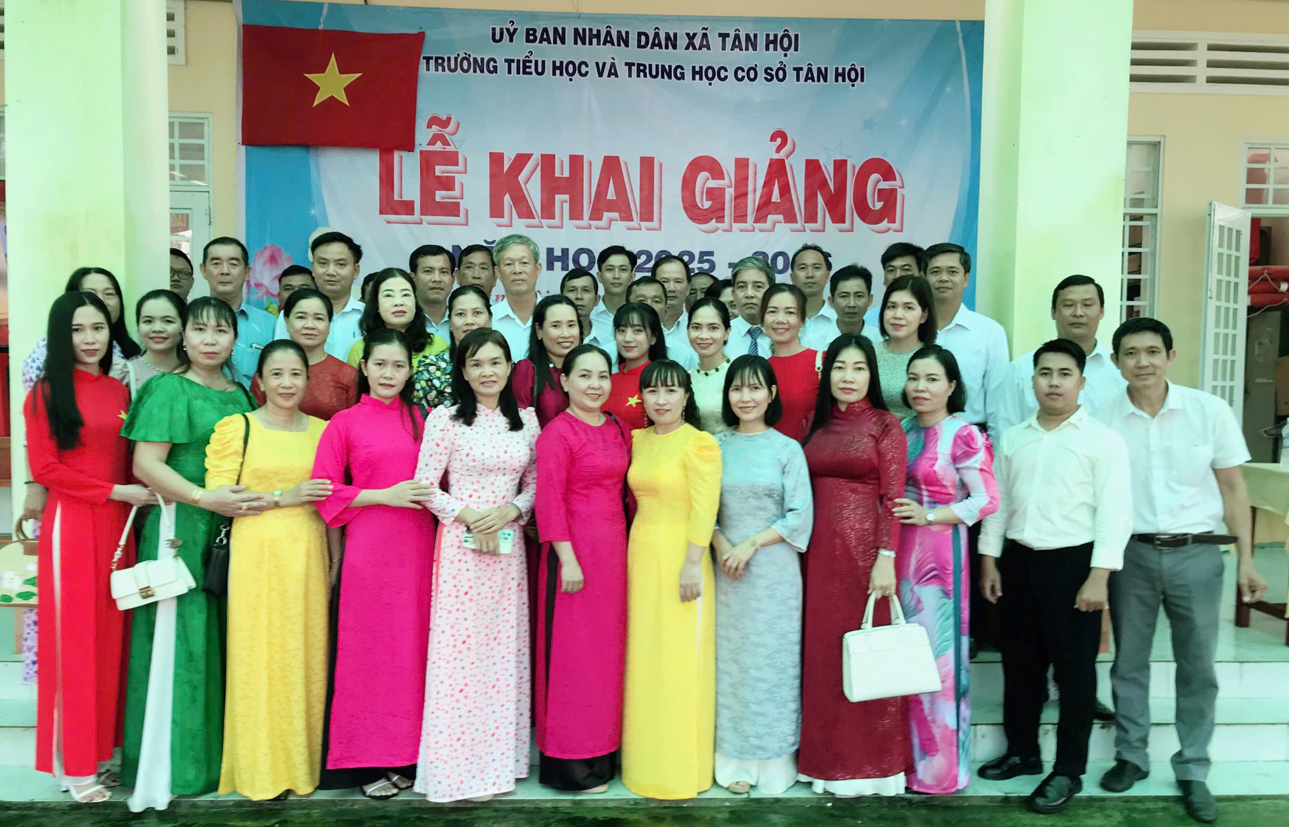 Lãnh đạo xã Tân Hội và cùng quý thầy, cô giáo Trường Tiểu học và THCS Tân Hội chụp ảnh lưu niệm Lễ khai giảng năm học 2025 -2026