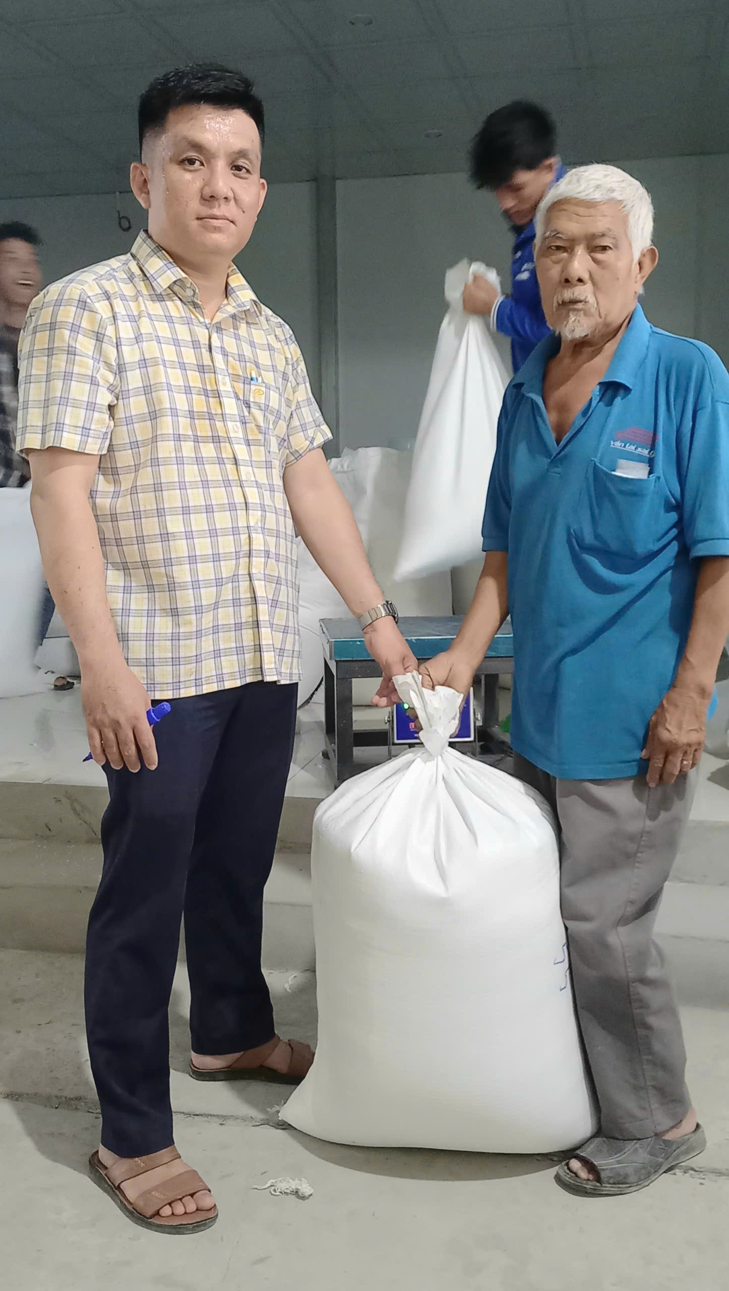 Ông Đinh Minh Tuấn, ông Quách Chí Tâm và ông Nguyễn Văn Hiệp – công chức Phòng Kinh tế trực tiếp tham gia thực hiện việc phân phát gạo hỗ trợ cho người dân trên địa bàn.