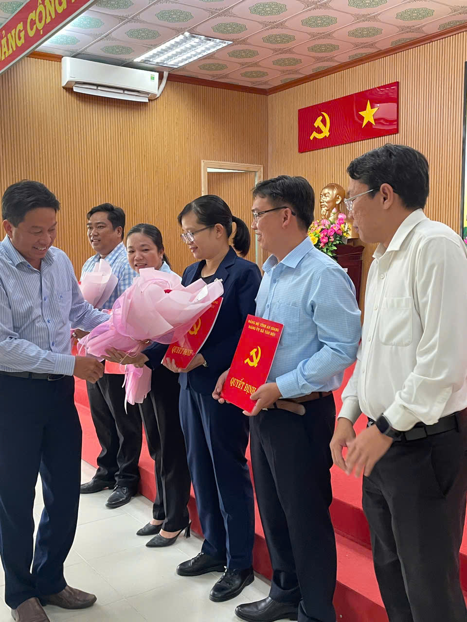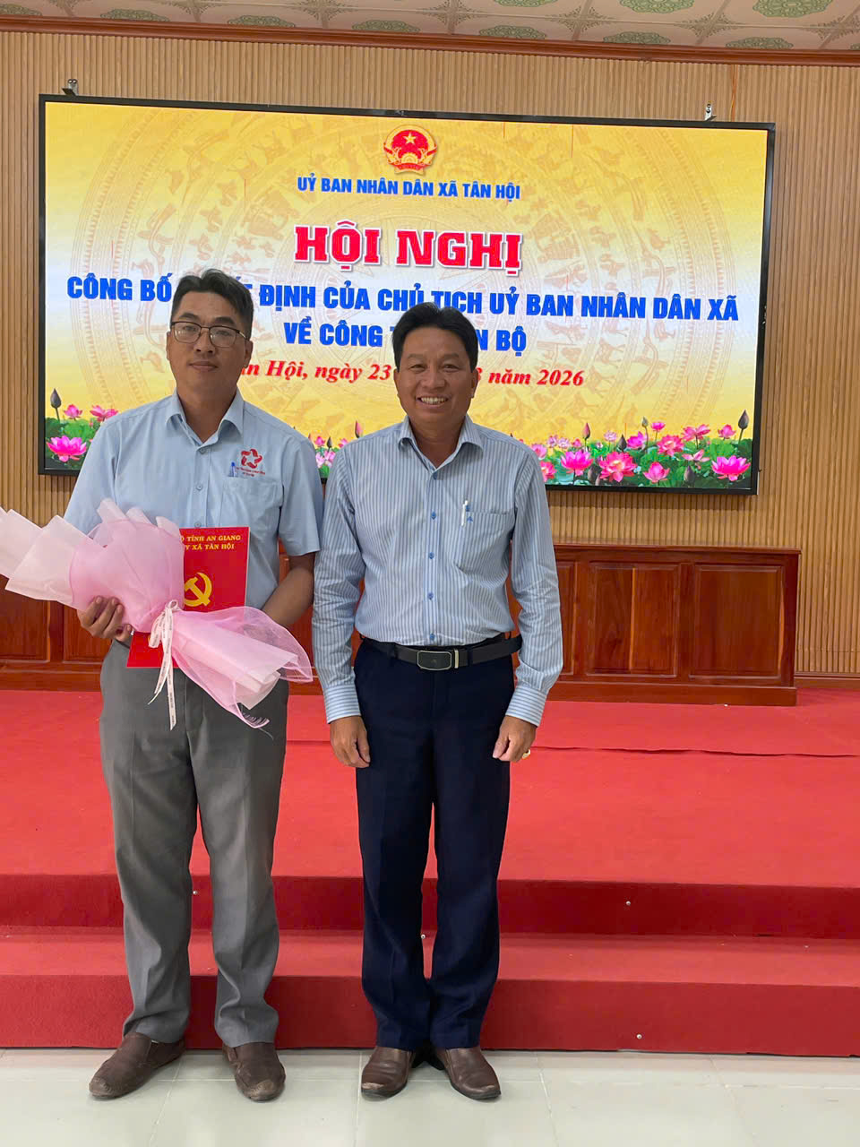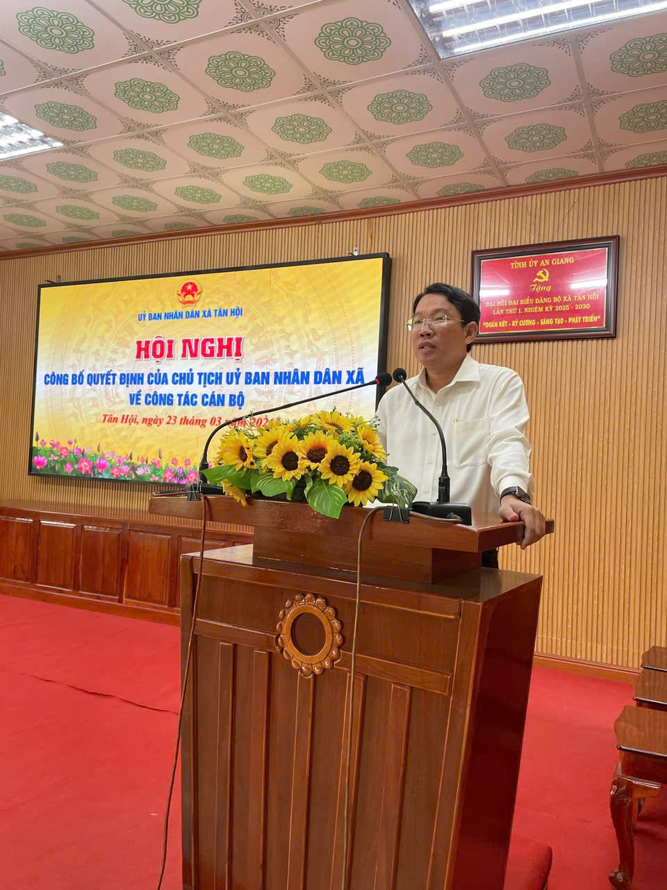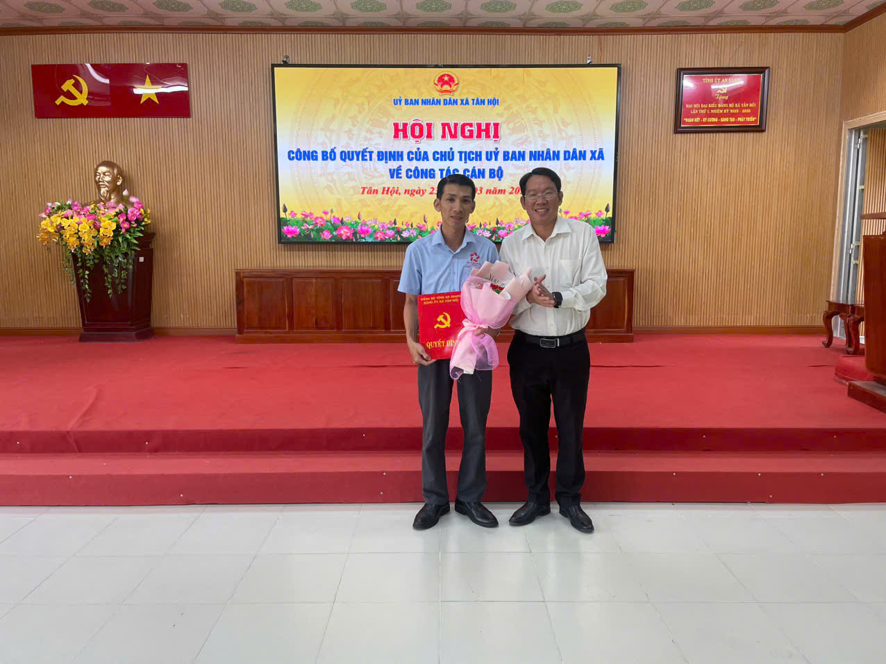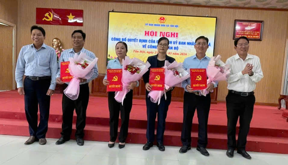 Tại buổi lễ, đồng chí Nguyễn Quốc Thuận, Phó Trưởng phòng Văn hóa - Xã hội đã công bố các quyết định của Chủ tịch UBND xã, gồm: Bổ nhiệm đồng chí Ngô Hoàng Thân, Phó Giám đốc Trung tâm Phục vụ hành chính công giữ chức vụ Giám đốc Trung tâm Phục vụ hành chính công xã Tân Hội; bổ nhiệm đồng chí Vũ Tuấn Anh, công chức Phòng Văn hóa - Xã hội giữ chức vụ Phó Giám đốc Trung tâm Phục vụ hành chính công xã; bổ nhiệm đồng chí Lâm Thu Quỳnh, công chức Phòng Văn hóa - Xã hội giữ chức vụ Phó Trưởng phòng Văn hóa - Xã hội; bổ nhiệm đồng chí Đặng Thị Ngọc Loan, công chức Phòng Kinh tế giữ chức vụ Phó Trưởng phòng Kinh tế; bổ nhiệm đồng chí Đỗ Thanh Kiệm, công chức Văn phòng HĐND-UBND xã giữ chức vụ Phó Chánh Văn phòng HĐND-UBND xã.