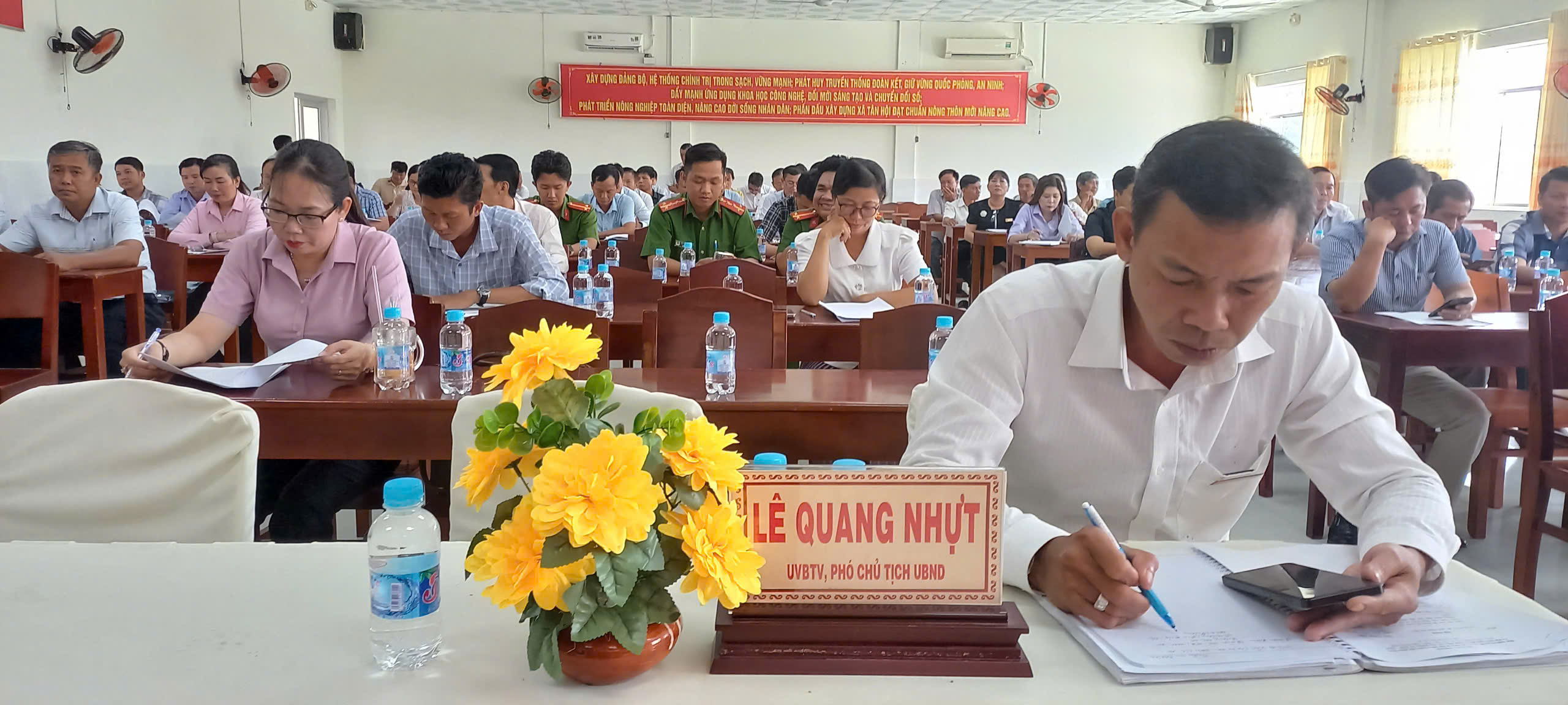 Tham dự và chỉ đạo hội nghị có đồng chí Nguyễn Hoàng Kha, Bí thư Đảng ủy xã, Trưởng Ban Chỉ đạo cuộc bầu cử; đồng chí Lâm Văn Út, Phó Bí thư Thường trực Đảng ủy, Chủ tịch HĐND xã, Phó Trưởng Ban Chỉ đạo; đồng chí Nguyễn Minh Ngọc, Phó Bí thư Đảng ủy, Chủ tịch UBND xã, Chủ tịch Ủy ban Bầu cử xã. Cùng tham dự có đồng chí Bùi Quốc Du, Chủ tịch Ủy ban MTTQ Việt Nam xã; lãnh đạo các cơ quan, ban, ngành, đoàn thể; thành viên Ban Chỉ đạo, Ủy ban Bầu cử xã; bí thư chi bộ, trưởng ấp, tổ trưởng các Tổ bầu cử và 75 cá nhân tiêu biểu được khen thưởng.