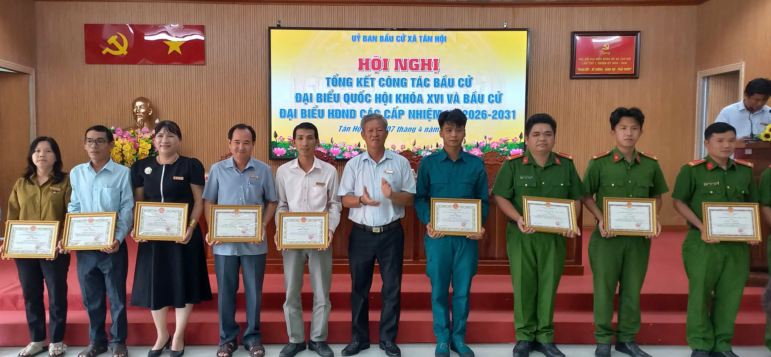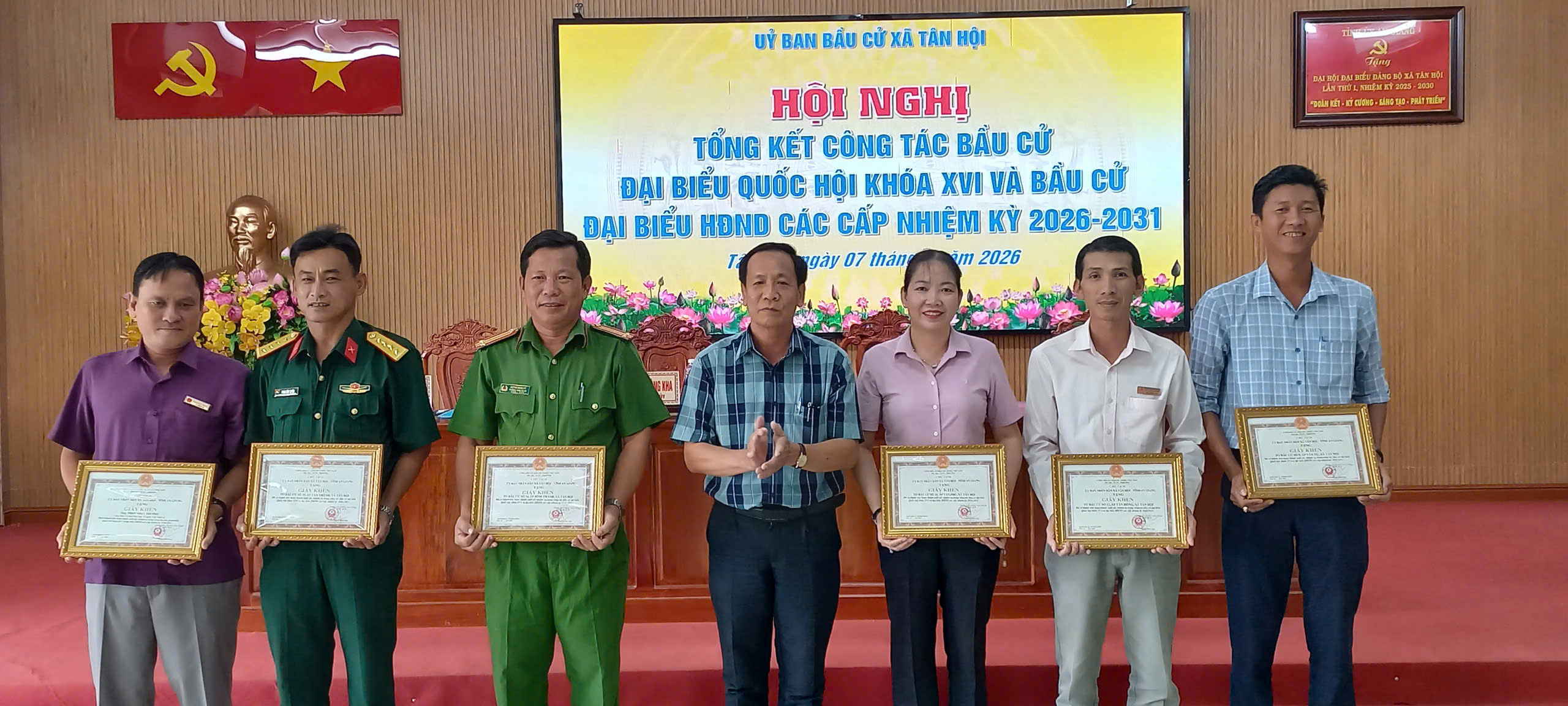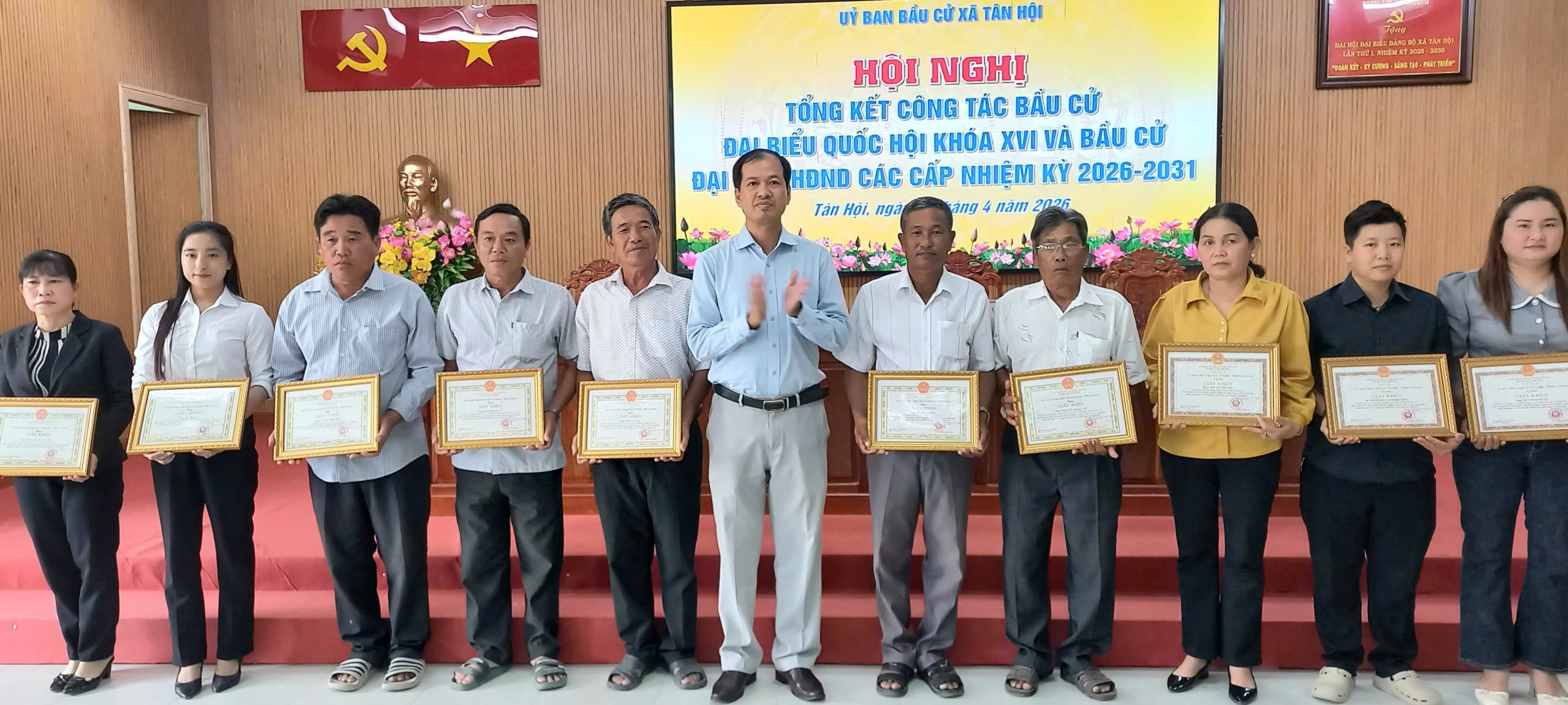 Nhân dịp này, UBND xã Tân Hội đã khen thưởng 15 tập thể và 75 cá nhân có thành tích xuất sắc trong công tác bầu cử đại biểu Quốc hội khóa XVI và đại biểu Hội đồng nhân dân các cấp nhiệm kỳ 2026–2031.