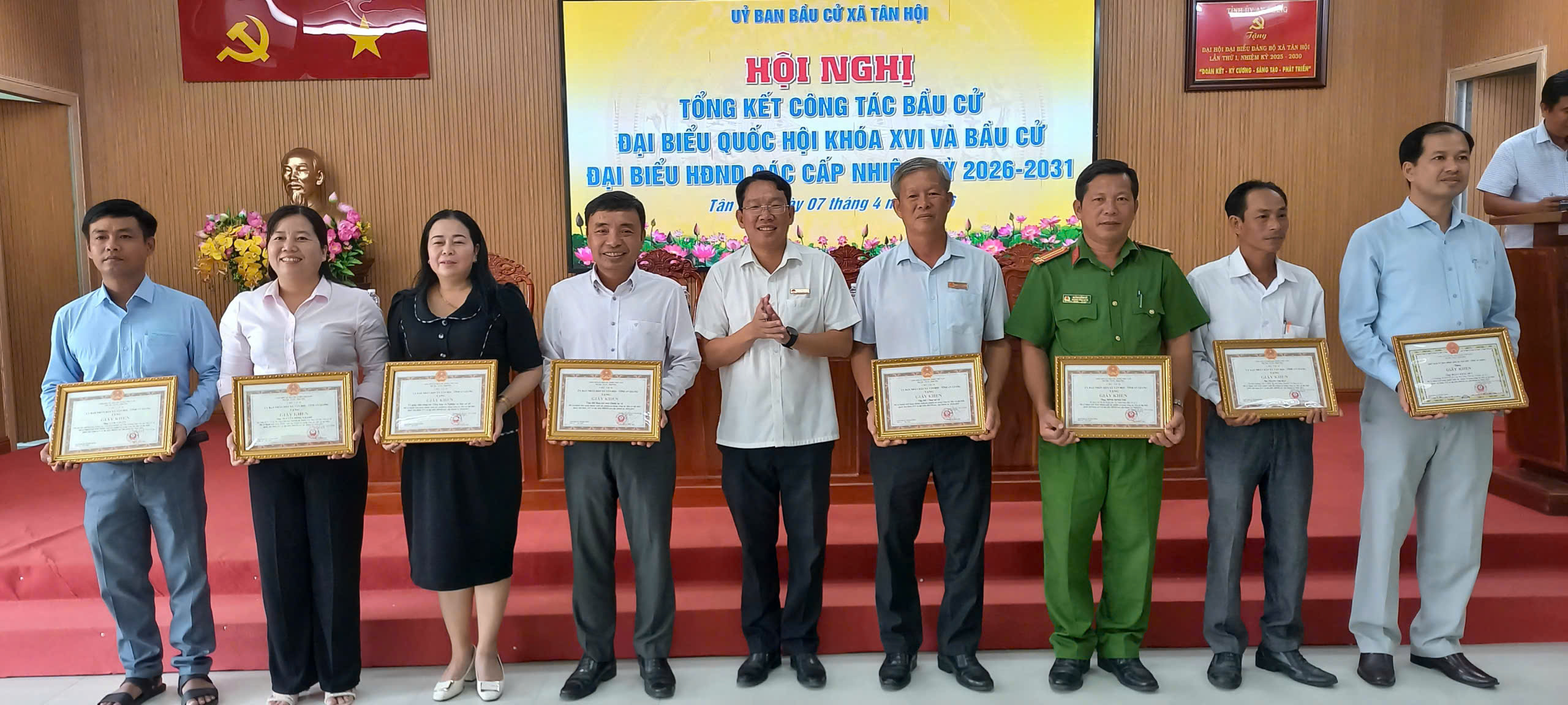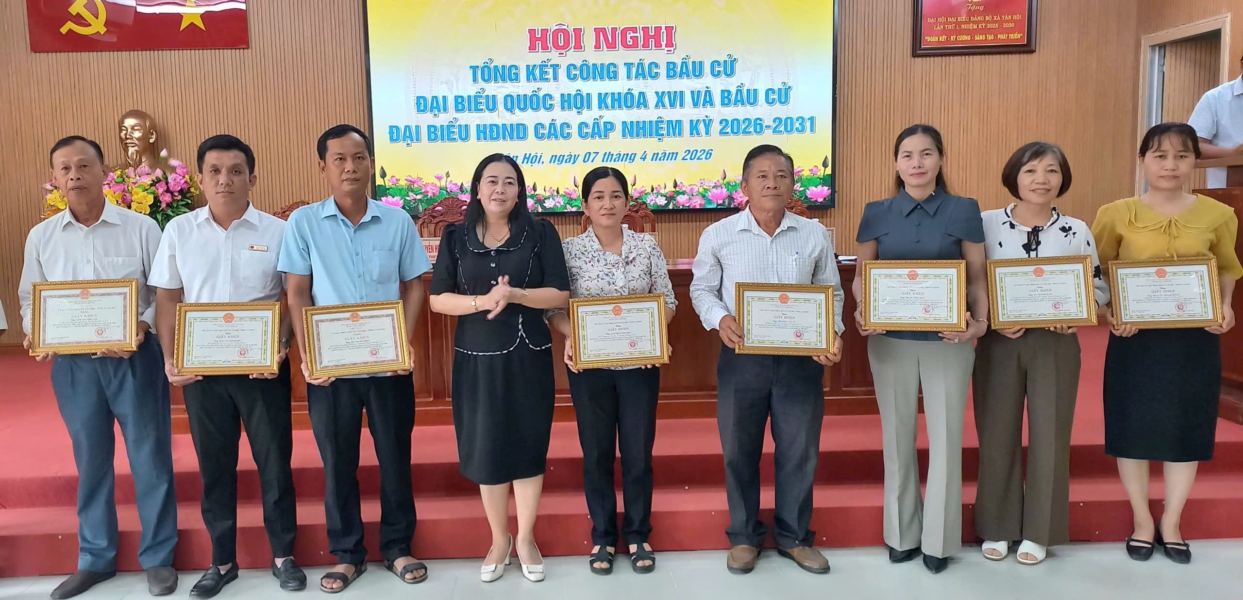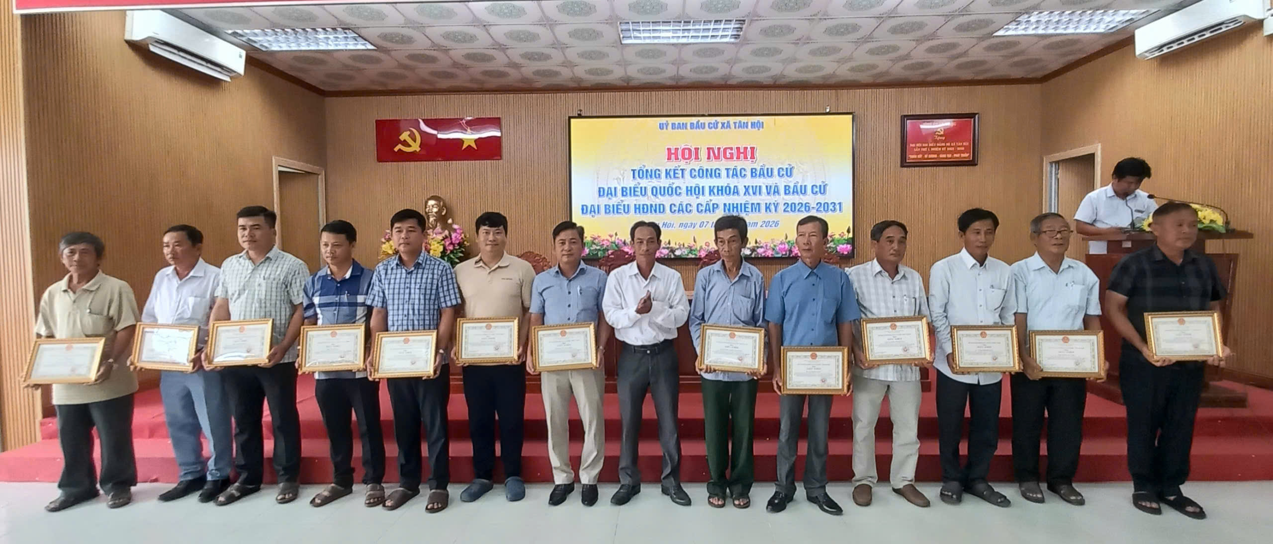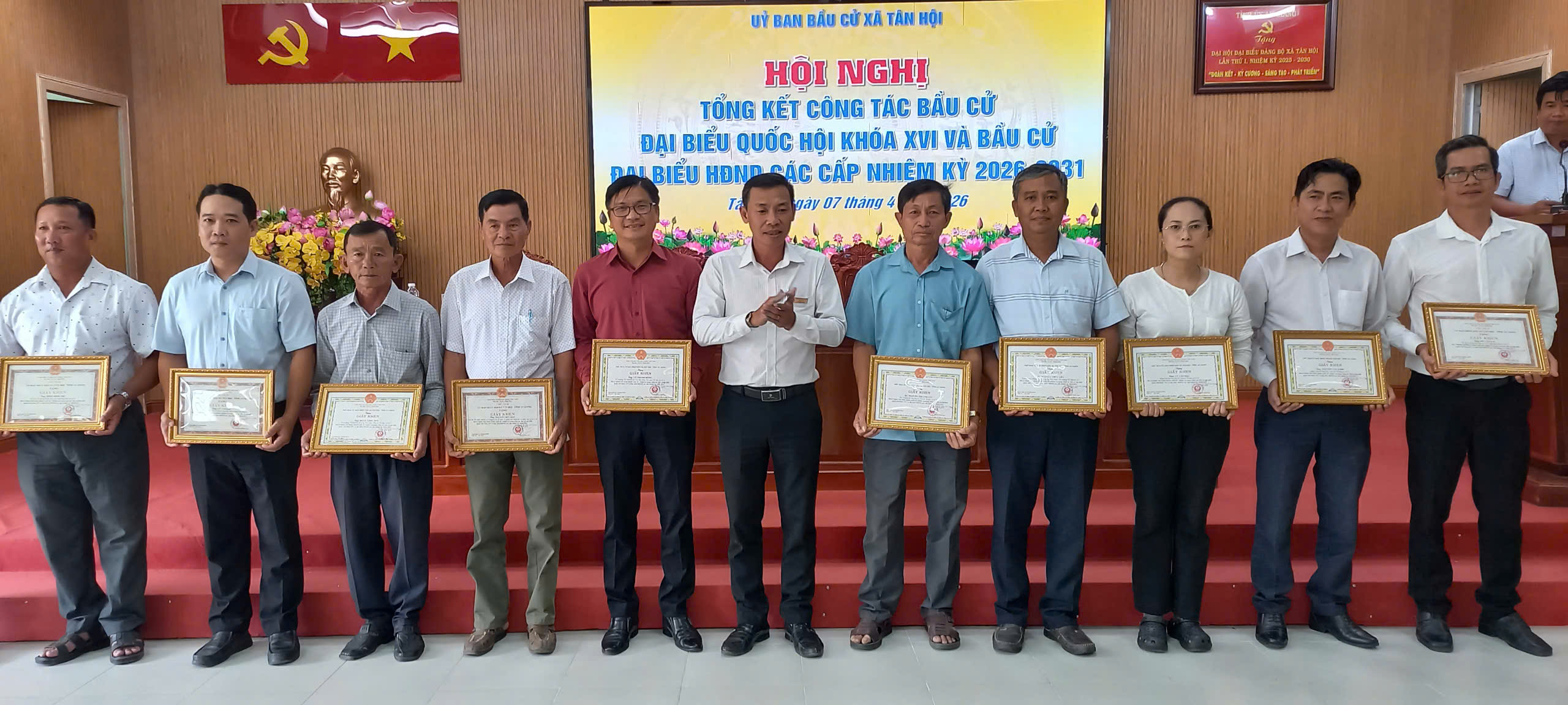 Nhân dịp này, UBND xã Tân Hội đã khen thưởng 15 tập thể và 75 cá nhân có thành tích xuất sắc trong công tác bầu cử đại biểu Quốc hội khóa XVI và đại biểu Hội đồng nhân dân các cấp nhiệm kỳ 2026–2031.
